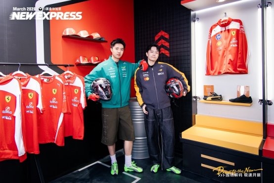 PUMA展区更像真实车队的装备区,法拉利、迈凯伦、阿斯顿马丁三大车队的联名赛车服与装备在赛道灯光与车队配色环境中呈现,吸引了许多观众换上赛车服拍照打卡,仿佛进入了自己的发车时刻。