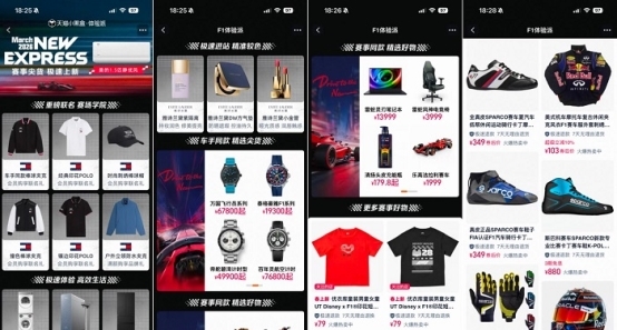 随着内容热度不断积累,天猫小黑盒又通过“F1体验派专区”承接消费需求,将车手同款、车队联名以及赛事周边商品集中呈现,让用户在体验和讨论之后自然进入电商场景,实现从内容关注到消费转化的顺畅连接。