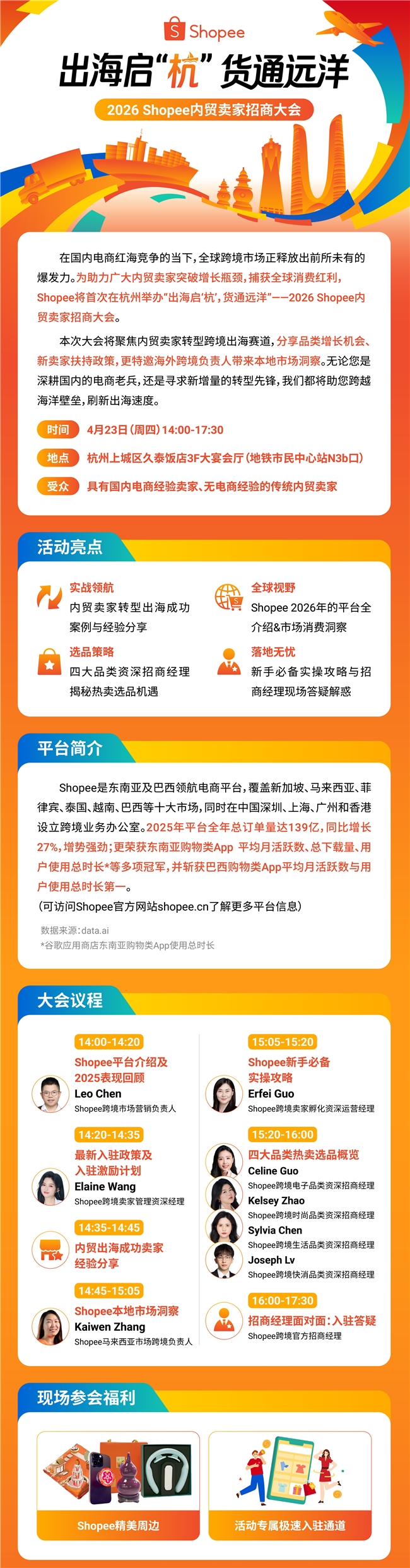 为帮助内贸卖家轻松转型、抓住全球红利,Shopee将于4月23日在杭州举办 “出海启‘杭’,货通远洋” 2026 Shopee内贸卖家招商大会 ,一站式打通从政策、选品、运营到落地的全链路出海方案。