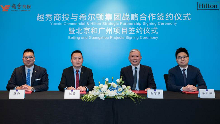 希尔顿集团与越秀商投签署战略合作,左起:越秀商投酒店公寓事业部总经理戴佳楷先生,越秀商投副总裁陈晓东先生,希尔顿集团大中华及蒙古区业务发展总裁黄德利先生,希尔顿集团大中华及蒙古区业务发展总监闫力先生
