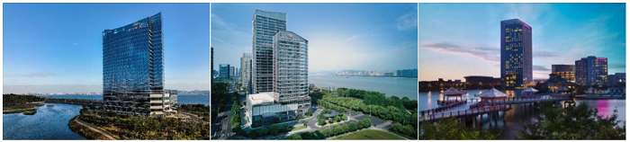 从左至右依次为:厦门集美海景皇冠假日酒店、杭州滨奥皇冠假日酒店、天津梅江中心皇冠假日酒店