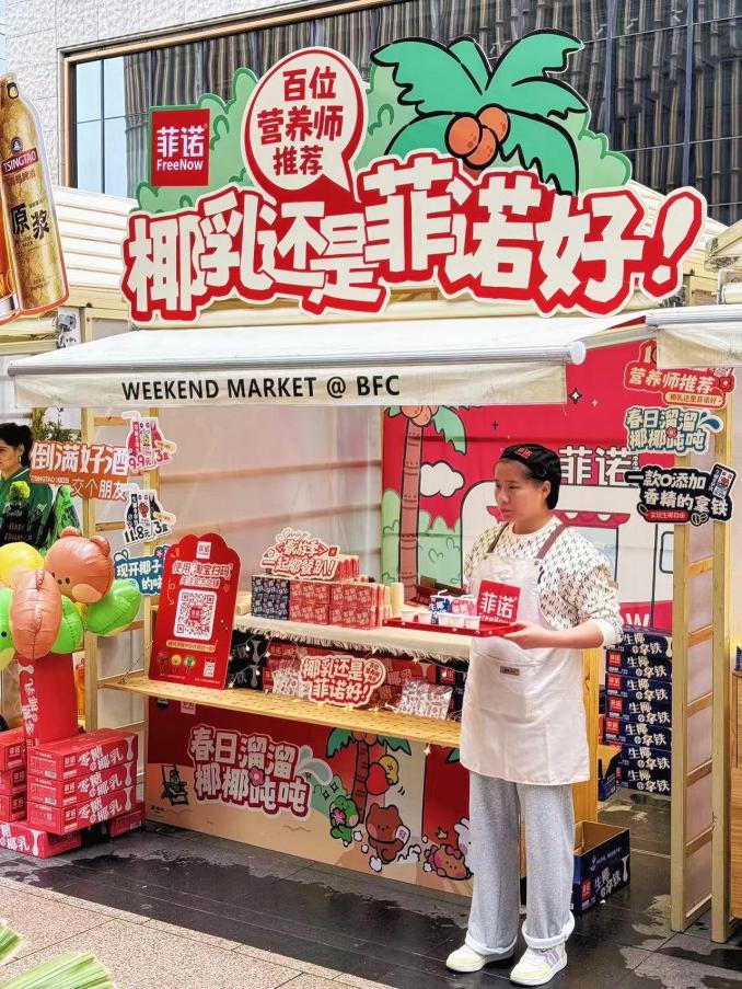 在4月27日,在上海BFC外滩中心开展的超级市集活动,聚集了数十家参展企业。时至春末夏初,菲诺将现场展台布置成更适宜消费者踏青出行的轻松装扮,在这样的氛围里,品尝一份椰香浓郁、清爽健康的椰基饮品更是显美味。