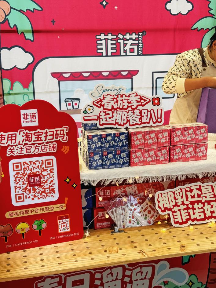 活动现场,除了可以畅享美味的椰基饮品以外,与菲诺互动,就可获得菲诺与LINE FRIENDS minini合作款IP周边,包含贴纸、气球等礼物,让椰基饮品走进了美好生活。